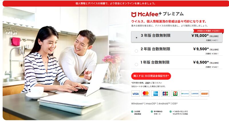 McAfee+プレミアムはウイルスを駆除できない場合、全額返金してもらえます。セキュリティの専門家が年中無休でサポート。セキュリティ以外にも、パスワードの自動入力や保管、複雑なパスワード生成もしてくれます。PCやスマホ、タブレットのセキュリティを守れます。購入から30日間返金保証付きで安心です。