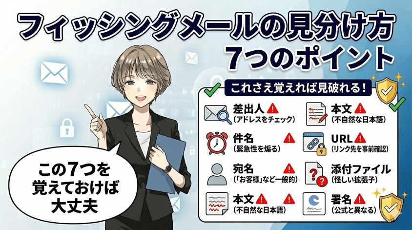 この7つを覚えておけば、ほとんどのフィッシングメールを見破れますよ!