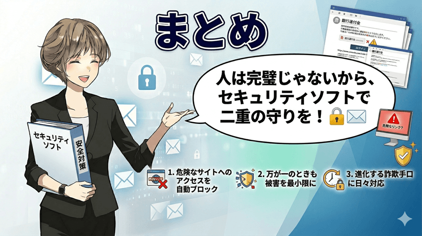 フィッシング詐欺の手口は日々進化しています。セキュリティソフトを導入することで、危険なサイトへのアクセスを自動でブロックし、万が一のときも被害を最小限に抑えられます。