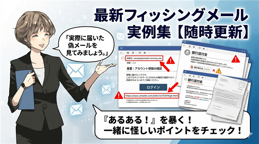 フィッシングメール(詐欺メール)は年々巧妙になっており、銀行や宅配業者、大手通販サイトをかたる偽メールが急増しています。この記事では実際に届いたフィッシングメールの実例をもとに、見分け方と対処法をわかりやすく解説します。