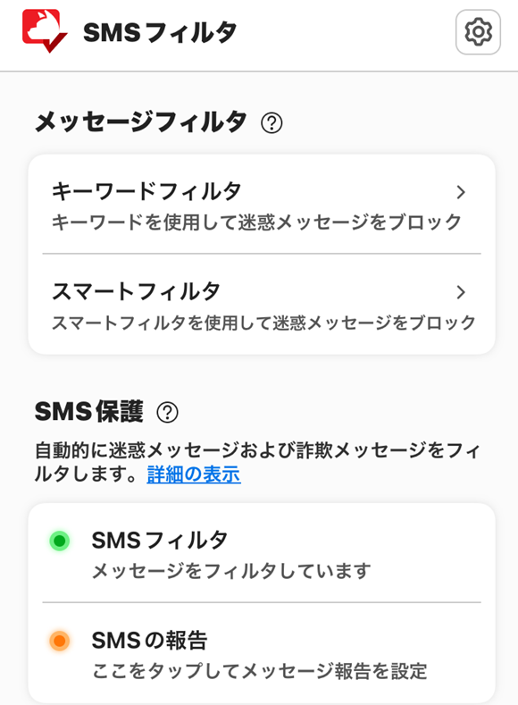 SMSフィルタの設定画面