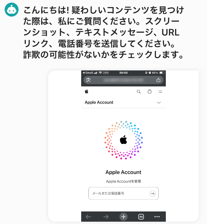 AI技術を利用して、スクリーンショット、テキストメッセージ、URLのリンク、電話番号に詐欺の可能性がないかチェックし処理を行います。